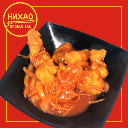 Куриный окорок обжаный в панировке, репчатый лук, сорковь, кисло-сладкий соус, отварной рис